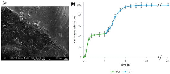 SEM image of MPE-loaded alginate beads after 24 h of exposure to SGF at 300× magnification (a) and the release profile of MPE from alginate beads in SGF during the first 4 h and from 4 to 24 h in SIF (b).