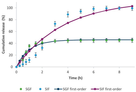 The results indicate that the release of MPE from alginate beads in SGF and SIF can be adequately described by the first-order model, as R2 was the closest to 1. Figure 10 further presents the experimental results fitted to the theoretically predicted release of MPE from alginate beads in SGF and SIF following the first-order release mechanism, which describes a concentration-dependent release. It shows a typical release of soluble agents encapsulated in porous systems [].