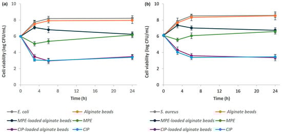 A plate count method was used to determine the inhibitory properties of MPE-loaded alginate beads against E. coli and S. aureus, representatives of Gram-negative and Gram-positive bacterial species, respectively. Both bacterial cultures in a final inoculum of 106 CFU/mL in nutrient broth were incubated for 24 h at 37 °C in the presence of control alginate beads, MPE-loaded alginate beads, and pure MPE solution. The number of viable bacterial colonies was determined at different time intervals (3, 6, and 24 h) using tenfold serial dilutions and the spread plate technique. The agar plates were incubated at 37 °C for 24 h to determine the bacterial colonies and CFU/mL. The percentage of bacterial reduction was calculated based on the ratio of the difference between the number of colony-forming units per mL of the control and the tested sample and the number of units of the control sample. CIP-loaded alginate beads and pure CIP solution were used as a positive control.