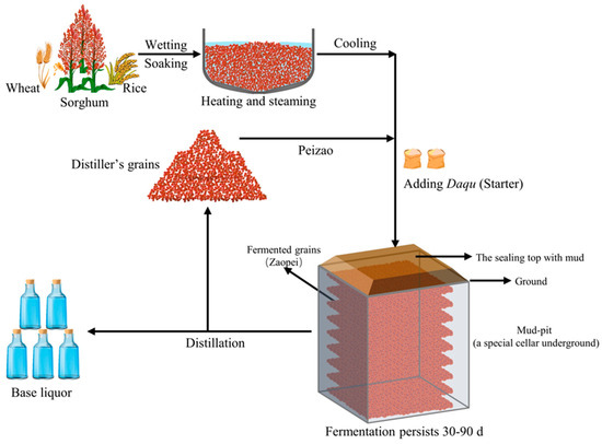 Baijiu, one of the six most commonly distilled spirits in the world, is a distinctive and valuable alcoholic beverage in China. According to data from the National Statistics Bureau, in 2022, the production of baijiu reached 6.71 billion liters, with sales soaring to 85.10 billion euros and achieving a profit of 28.28 billion euros [1], making a significant contribution to the steady growth of the national economy. Baijiu is categorized into four primary types based on flavor: strong-flavor, sauce-flavor, light-flavor, and rice-flavor. Among these, strong-flavor baijiu enjoys widespread recognition and preference by Chinese consumers, commanding over 60% of the market share of baijiu in China, playing a pivotal role in the development of the baijiu industry [2,3]. Although the brewing techniques of strong-flavor baijiu vary by region, their key processes remain largely consistent (Figure 1). These processes include grains (mainly sorghum) crushing, soaking, distilling with previously fermented grains from the preceding brewing cycle, mixing thoroughly with Daqu powder after spreading and cooling, sealing, and fermenting in mud-pit for 60–90 days. Subsequently, the fermented grains are spaded out and distilled to obtain base liquor, stored, and then blended to produce finished baijiu for sale [3,4,5,6].