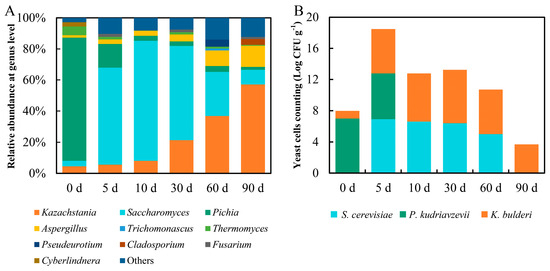 The composition of fungal community (A) and the yeast cells counting (Log CFU g−1) of dominant yeasts (B) in fermented grains during strong-flavor baijiu brewing.