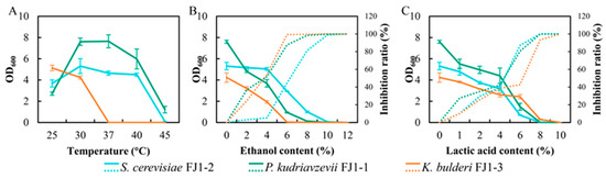 The characteristics of isolated yeasts on temperature tolerance (A), ethanol tolerance (B), and lactic acid tolerance (C). Here, the continuous line represents the OD600, while the broken line states the inhibition ratio.