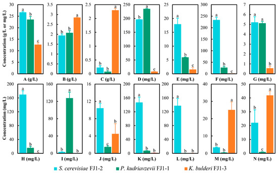 The metabolites of the three yeasts cultured by sorghum juice medium, including ethanol (A), lactic acid (B), propionic acid (C), acetic acid (D), caproic acid (E), octanoic acid (F), nonanoic acid (G), decanoic acid (H), ethyl acetate (I), ethyl caproate (J), ethyl octoate (K), ethyl caprate (L), ethyl benzoate (M), and phenol (N).