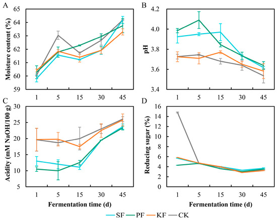 The moisture of the four groups showed an increasing trend (Figure 5A), and this uptrend could be attributed to microbial activity that metabolizes macromolecules and produces H2O [18]. However, the pH and acidity exhibited opposite dynamics among the groups, with SF and PF grouping together and differing from KF and CK (Figure 5B,C). In this regard, KF and CK groups had higher acidities than those of SF and PF groups during the whole fermentation cycle (Figure 5C), outlining that more organic acids were produced. As for the change in reducing sugar, a broadly similar trend was observed: it dropped from day 1 to day 30 and then stabilized (Figure 5D). However, significant differences in content of reducing sugar were observed among the four groups on day 1 (Figure 5D), with the CK group exhibiting a significantly higher content than the other three groups (Figure 5D). This suggests that the additional yeast cells introduced from reinforced Fuqu consumed a large amount of reducing sugar within one day. In addition, P. kudriavzevii possessed better reducing sugar metabolic capability than the other two yeasts since the SF group displayed the lowest reducing sugar content on day 1 (Figure 5D). This phenomenon supported that P. kudriavzevii occupied the most proportion of yeast community at the beginning of fermentation in situ (Figure 2), as it could quickly consume reducing sugar for growth and propagation and might capture more ecological niches [22].