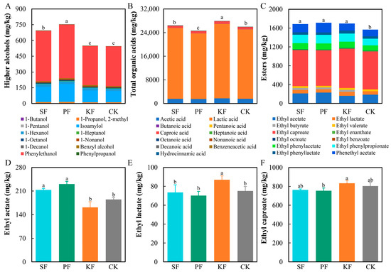 Three main flavor substances of fermented grains during the application of reinforced Fuqu in baijiu brewing at lab scale, including higher alcohols at top 12 (A), total acids at top 11 (B), total esters at top 12 (C), ethyl acetate (D), ethyl lactate (E), and ethyl caproate (F).