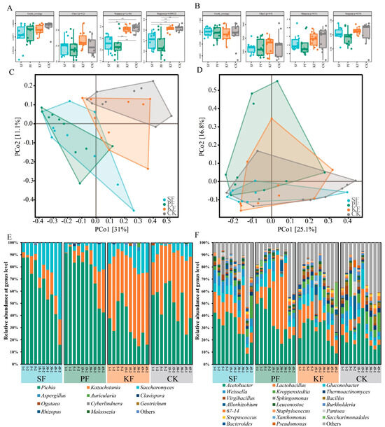 Microbiota in fermented grains during baijiu brewing at lab scale with the application of reinforced Fuqu. Here, fungal community α-diversity (A), bacterial community α-diversity (B), fungal community β-diversity (C), bacterial community β-diversity (D), fungal community composition (E), and bacterial community composition (F) (BrayCurtis distance (R2 = 0.8384, p = 0.0001) was used for β-diversity with confidence at 0.95).