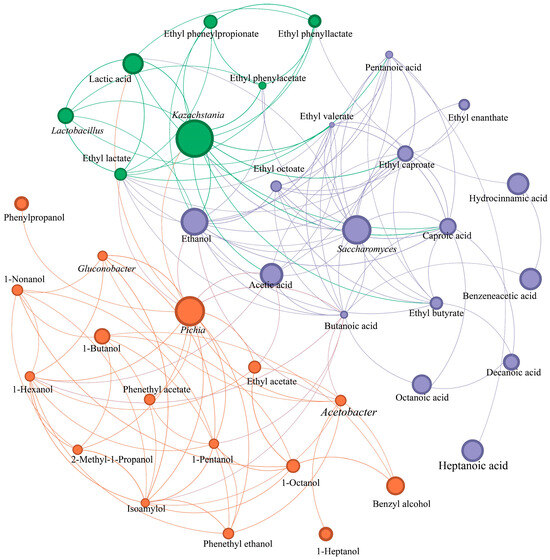 Co-occurrence network analysis of the dominant microbial genera and flavor compounds (similarity threshold = 0.6, p < 0.05).