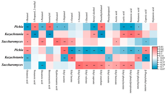 Spearman heatmap of relationships between core yeasts and flavor compounds (* p < 0.05, and ** p < 0.01).