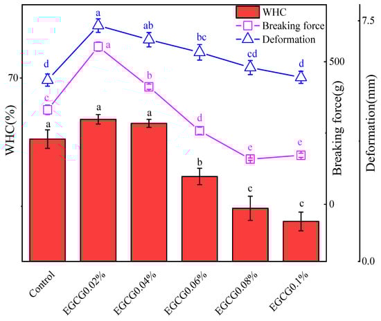 WHC, breaking force, and deformation of surimi gels with different amounts of EGCG (the same indicator annotated with different letters indicates the significant difference (p < 0.05); the same letters indicate the difference is not significant (p > 0.05)).
