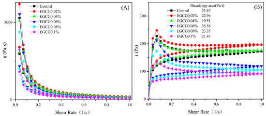 Static rheological curve ((A): viscosity, (B): thixotropy) of surimi sols with different amounts of EGCG.