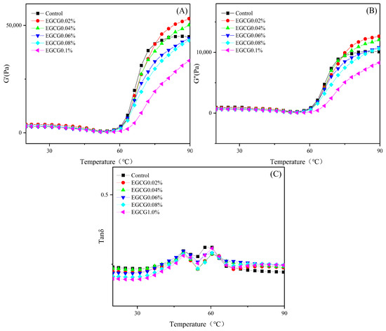 Dynamic rheological curve ((A): G′; (B): G″; (C): tan δ) of surimi sols with different amounts of EGCG.