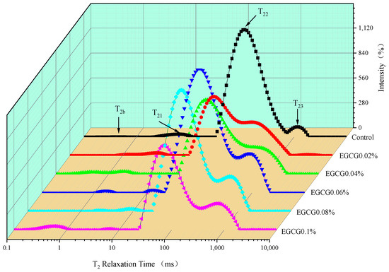 The LF-NMR T2 relaxation time technique was used to analyze the dynamic distribution of water inside the gel effectively [31]. Figure 4 shows the T2 relaxation time profiles fitted by the LF-NMR attenuation curve of the control and surimi gels with different concentrations of EGCG. Four relaxation peaks appeared at the T2 relaxation time profiles for all samples, representing the water distribution and migration of the different components in the gels, at positions of about 0.1–1 ms (T2b), 1–10 ms (T21), 100–1000 ms (T22), and 1000–10,000 ms (T23), respectively [2]. These four components were classified to three water states in the gels; namely, bound water(T2b), immobilized water (T21 and T22), and free water (T23), respectively. The bound water was tightly bound to non-aqueous substances in the gel system; the immobilized water represented by T21 had weak mobility and was inside the gel network structure, while the immobilized water represented by T22 had certain mobility and was between the gel network structures; and the free water was more mobile and easily removed from the gel system [32]. The largest T22 peak appeared in all samples in Figure 4 represented immobilized water. However, the T23 relaxation peaks of EGCG 0.02% and EGCG 0.04% were shifted to the fast relaxation direction on the left and merged with the respective T22 relaxation peaks. These indicated that after the addition of 0.02% and 0.04% EGCG, the free water in the surimi gels was converted to immobilized water. The immobilized water accounted for the vast majority of the water in the surimi gel, which depended on the change in the three-dimensional network gel structure, an important indicator that directly determined the WHC.