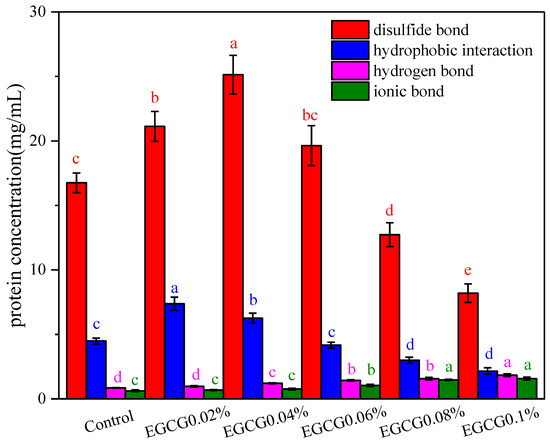 Effects of EGCG addition on chemical interactions of surimi gels (the same indicator annotated with different letters indicate a significant difference (p < 0.05); the same letters indicate the difference is not significant (p > 0.05)).