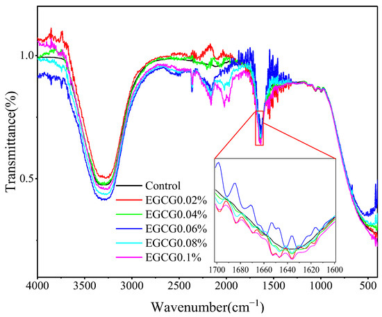 To further investigate whether EGCG affected the secondary structure of MP in the surimi gels, they were analyzed by FT-IR, as shown in Figure 6. Most of the protein secondary structure changes were analyzed by spectral changes of FT-IR in amide-I band (1700–1600 cm−1) [38]. The characteristic frequency of the amide I band can be used to represent the secondary structure of proteins, mainly including C=O stretching vibration and C-N stretching vibration [39]. The absorption peak corresponds to the protein secondary structure as follows: 1610–1640 cm−1 corresponds to a β-sheet, 1640–1650 cm−1 corresponds to a random coil, 1650–1658 cm−1 corresponds to a α-helix, and 1660–1695 cm−1 corresponds to a β-turn [40].