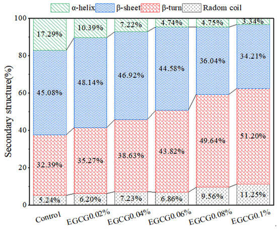 Changes in MP secondary structures of surimi gels with different amounts of EGCG.