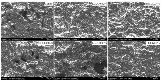 Microstructure is an intuitive reflection of the surimi gel state, are described in Figure 8. The control had uneven structures, large pores, and irregular shape. The microstructures of EGCG 0.02% and EGCG 0.04% were compact and homogeneous, and had better gel formation ability. However, when the amount of EGCG increased to 0.06–0.1%, the surimi gel network structure changed significantly: the gel surface gradually became rough, loose, and uneven, the pores became larger and larger, and the gel structure of EGCG 0.1% was broken and accompanied by the lamellar structure. This was mainly due to the stronger interaction between higher concentration of EGCG and MP, which hindered the cross-linking between protein molecules, and the protein network structure was poor, and ultimately could not form a better gel network structure. These result were consistent with the fact that the higher concentration of EGCG worsened the gel strength, WHC, and rheological properties.