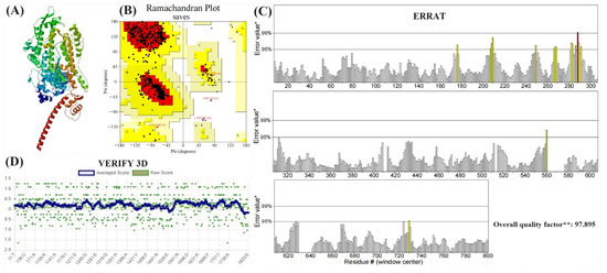 Evaluation of SCMHC modeling results. (A) SCMHC results; (B) Ramachandran plot; (C) ERRAT (* On the error axis, two lines are drawn to indicate the confidence with which it is possible to reject regions that exceed that error value; ** Expressed as the percentage of the protein for which the calculated error value falls below the 95% rejection limit. Good high resolution structures generally produce values around 95% or higher. For lower resolutions (2.5 to 3A) the average overall quality factor is around 91%.); (D) VERIFY 3D.