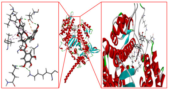 The molecular structure of the ligand EGCG was obtained from the pubchem website (https://pubchem.ncbi.nlm.nih.gov/ (accessed on 1 August 2023)). The molecular docking of EGCG and SCMHC were performed by Discovery Studio 2019, and the docking result with the highest score was selected for further analysis.
