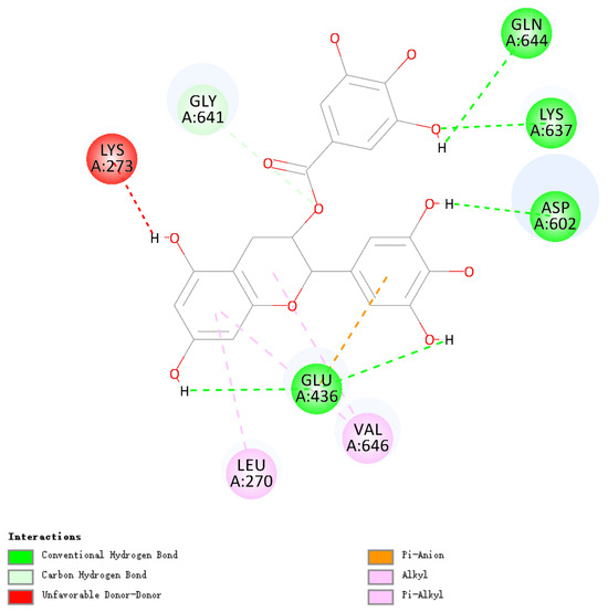 It can be seen from the 2D schematic of the non-covalent interaction (Figure 11) that EGCG interacted with Gln 644, Lys 637, Asp 602, Glu 436, Gly 641, Leu 270, Val 646, etc. Hydrogen bonds were formed between EGCG and Gln 644, Lys 637, Asp 602, Glu 436, and Gly641. Hydrophobic interactions were reflected in the Pi-Alkyls, which occurred between the benzene ring from EGCG and the alkyl group from Leu 270 or Val 646. The Pi-Anion belonging to electrostatic interaction occurred between the benzene ring from EGCG and the anion from Glu 436. These showed that EGCG formed non-covalent interactions with SCMHC mainly through hydrogen bonds, hydrophobic interactions, and electrostatic interactions. The amount of these non-covalent interactions affected the myosin molecular structure changes during MP heat induction, and thus affected the surimi gel properties. The lower concentrations of EGCG formed appropriate amounts of the non-covalent interactions with silver carp myosin molecules, so that the myosin molecules unfolded appropriately and the hydrophobic groups were exposed, and formed more ordered β-sheet structures, which also produced more disulfide bonds and hydrophobic interactions, and were favorable to the surimi gel. However, the higher concentrations of EGCG formed numerous non-covalent interactions with myosin molecules, which had a large impact on the myosin molecular structure, causing further disordered aggregation, folding and denaturation, and also hindered the formation of hydrophobic interactions and disulfide bonds.