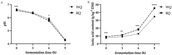 Changes in pH and lactic acid content during lactic fermentation of white and red quinoa varieties: (A) pH, (B) lactic acid content. Significant differences are shown using * p < 0.05, ** p < 0.01, *** p < 0.001, and **** p < 0.0001 levels. WQ: white quinoa, RQ: red quinoa.