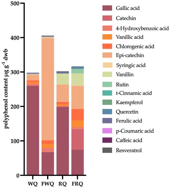 Changes in the polyphenol profile of each quinoa variety before and after fermentation. Results are displayed based on mean values. WQ: unfermented white quinoa; RQ: unfermented red quinoa; FWQ: fermented white quinoa; FRQ: fermented red quinoa.