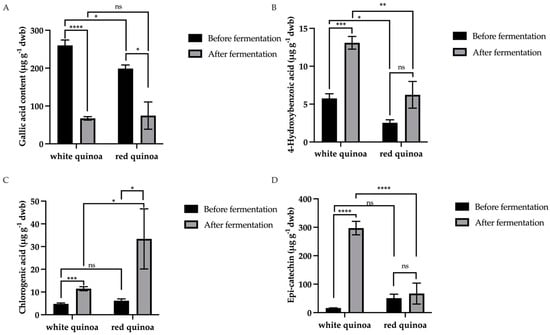 Most significant changes in the concentration of selected polyphenols in quinoa after short-term lactic fermentation: (A) gallic acid, (B) 4-hydroxybenzoic acid, (C) chlorogenic acid, and (D) epicatechin in white and red quinoa varieties before and after fermentation. Significant differences are shown using * p < 0.05, ** p < 0.01, *** p < 0.001, and **** p < 0.0001 levels. ns: no significant different.