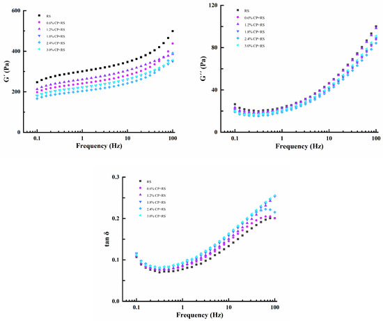Figure 2 displays the dynamic rheological measurement analysis results of RS and CP–RS gels. Tan δ value (G″/G′) is an important numerical value used to evaluate viscoelastic behavior. During dynamic rheological assessment, as the frequency was elevated, sample G′ and G″ gradually rose, and G″ decreased consistently compared with G′. This indicated that our samples exhibited characteristics of a typical weak gel [42]. The G′ in each CP–RS gel decreased compared with pure RS, whereas G′ declined after adding CP. Moreover, although the G″ of all CP-RS gels was lower than that of pure starch, the increases were smaller compared with G′. The value of tan δ was less than 1 and increased with the addition of CP. Therefore, it can be inferred that the impact of CP was predominantly on the elasticity of the gelatinized RS. Since the cross-linked network was formed by amylose as the main polymer [43], it is conceivable that the association of CP with leached amylose could have diminished reactivity among the amylose molecules themselves. This reduction in interaction might have resulted in a slower reaggregation of amylose, consequently diminishing the elasticity of the starch paste.