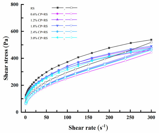 Figure 3 shows the steady shear properties of the CP–RS gels. There was a clockwise thixotropic loop observed between the ascending and descending curves, with the loop area representing the energy necessary for breaking the system structure. In the shear rate range examined in the present research, the Herschel–Bulkley model showed a high fitting degree with the flow curves (R2 > 0.99, Table 3). The τ0 of the complex system decreased with the addition of CP and the n was <1, suggested a decrease in apparent viscosity with the increasing shear rate. Therefore, this was the characteristic starch gel system indicative of a pseudoplastic fluid behavior; similar results have been published for other starch–NSP gels [44].