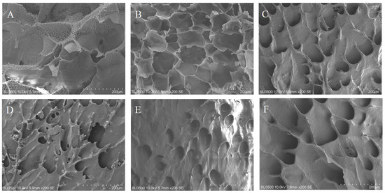 SEM images showing CP–RS gels with diverse CP concentrations of 0.0% (A), 0.6% (B), 1.2% (C), 1.8% (D), 2.4% (E), 3.0% (F).