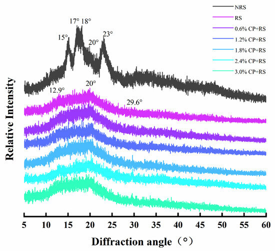 XRD patterns for native RS and CP–RS gels are shown in Figure 5. The pure RS displayed a classic “A”-type diffraction pattern in which one potent doublet peak was observed at around an 17° and 18° diffraction angle. It also exhibited stronger single diffraction peaks at 15° and 23°, respectively, close to the results of Ren et al.’s study [33]. The A-type XRD pattern of RS was lost after gelatinization. After gelatinization, the peaks were distributed at 12.9°, 20°, and 29.6°, similar to the study by Q. Zhao et al. [51]. The diffraction pattern changed because the crystalline structure was destroyed because of gelatinization. Nonetheless, the peak shapes of samples across nearly all concentrations displayed no notable variations, indicating that the influence of CP on the crystalline structure of RS might not have been reliant on concentration, nor was a direct correlation apparent.
