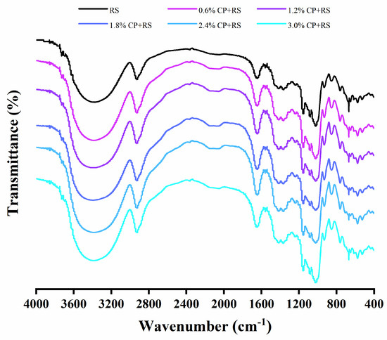 The FT-IR analysis of RS and CP–RS gels is shown in Figure 6. Given that both the starch and CP were polysaccharides with a high hydroxyl group content, an absorption peak was observed close to 3400 cm−1, which was associated with O-H stretching vibrations [52]. Typically, the signal seen near 2900 cm−1 corresponded to anti-symmetric and symmetric stretching vibrations of -CH and -CH2 groups. Additionally, peaks observed at 1600–1700 cm−1 could have been because amide or water were present [53]. In contrast to the pure RS, the introduction of CP into the starch did not result in any new absorption peaks, which suggested the absence of covalent bonding between CP and RS.