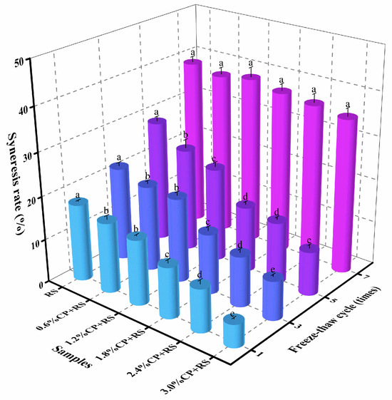 Freeze–thaw stability of RS and CP–RS gels with different CP concentrations. Different letters indicate significant differences among group (p < 0.05).