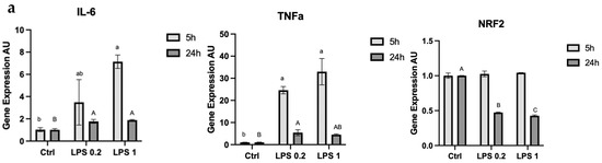 In order to test MEC stress response, cells were exposed to LPS or H2O2 for 5 or 24 h, which were used to determine gene expression levels (Figure 1a,b). Expression levels of proinflammatory cytokines and phase 2 proteins had a different pattern between the two stressors and in terms of the time frame of gene expression modulation.