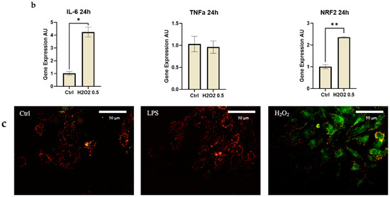 Our results show that mitochondrial membrane potential was impaired and levels of NRF2 expression were elevated following the H2O2 treatment but not the LPS treatment (Figure 1). This could be attributed to the fact that LPS stimulates expression of proinflammatory cytokines IL-6 and TNFα [25,26] by binding to Toll-Like Receptor 4 (TLR4), whereas H2O2 is rapidly broken down into reactive oxygen species (ROS). Elevated ROS levels induce the release of the NRF2 protein from its chaperone, allowing it to activate the phase 2 antioxidant response [27].