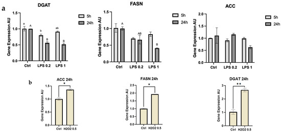 Gene expression levels of de novo fatty acid synthesis pathway genes, DGAT, ACC, and FASN in MECs after (a) 5 or 24 h of exposure to 0.2 or 1 μg of LPS or (b) 24 h of exposure to 0.5 mM H2O2. Significant differences (p ≤ 0.05) are indicated with different letters or asterisks. Uppercase or lowercase letters are used for comparing results between treatments within the same time frame (5 or 24 h).