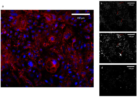 (a) Representative image of MECs nuclei stained with DAPI (blue) and lipid droplets stained with Nile red (red) and visualized under a fluorescence microscope and (b) the same image processed by a Python script. Large Lipid droplets that normally show clusters in the image and their size cannot be determined at high intensity are identified by the software and measured, indicated with arrows. Representative images processed by ImageJ software of MEC stained with Nile Red, under the conditions of (c) low contrast and (d) high contrast. Higher intensity results in clusters of large lipid droplets that are indistinguishable as separated droplets and therefore excluded by the software when size is recorded.