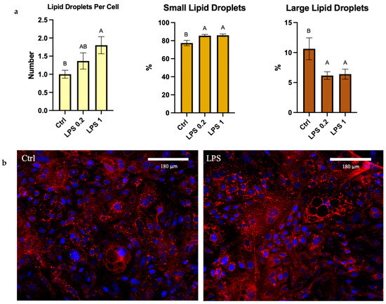 (a) Lipid droplet number and size distribution percentage out of total lipid droplets after 24 h of exposure to 1 μg of LPS. Significant differences (p ≤ 0.05) are indicated by different letters. (b) Representative images of MECs treated with 1 μg of LPS for 24 h compared with control (Ctrl). Lipid droplets stained with Nile Red (red) and Cell Nuclei stained with DAPI (blue).