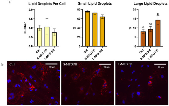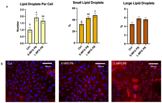 The percentage of small lipid droplets significantly increased by 16% and 11% after exposure to postbiotics from small and large MFGs, respectively (p = 0.0041). Exposure to postbiotics from small and large MFGs led to a 1.5-fold and 2-fold increase in lipid droplet number per cell, respectively (p = 0.014) (Figure 5a).