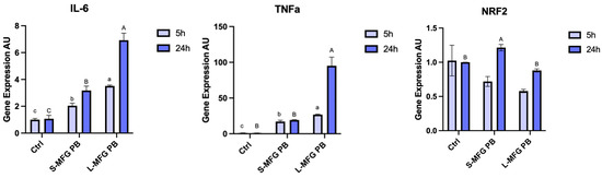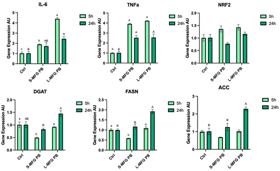 Gene expression levels of proinflammatory cytokines IL-6 and TNFα, of the phase-2 protein NRF2, and of de novo fat synthesis-related genes in MECs after exposure of 5 or 24 h to postbiotics from E. coli grown on small or large MFGs (S-MFG PB and L-MFG PB, respectively). Significant differences (p ≤ 0.05) are indicated with different letters. Uppercase or lowercase letters are used for comparing results between treatments within the same time frame (5 or 24 h).