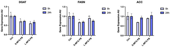 Gene-encoding enzymes involved in de novo lipid synthesis showed expression patterns similar to those found when MECs were exposed to LPS and were not significantly different between postbiotics originating from bacteria grown on large or small MFGs. DGAT expression decreased when MECs were exposed to postbiotics from both small and large MFGs, 0.25-fold and 0.5-fold, respectively (p = 0.017). FASN behaved similarly, decreasing 0.5-fold and 0.25-fold after 5 h of exposure to postbiotics from small MFGs and large MFGs, respectively (p = 0.0087). Similarly to the exposure to LPS, ACC did not show a significant difference in expression (p = 0.1053) upon exposure to postbiotics.