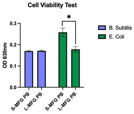 Cell viability was tested using an XTT cell proliferation kit, after 5 h of exposure to postbiotics collected from B. subtilis and E. coli grown on either small or large MFGs (Figure 9). We found that the viability of cells exposed to E. coli postbiotics from large MFGs was lower than that of small MFGs (p = 0.05), while there was no significant difference in cell viability after exposure to B. subtilis postbiotics from small and large MFGs (p = 0.749).