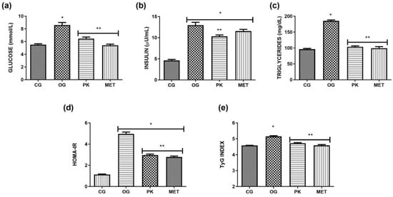 Glucose (a), insulin (b), and (c) triglyceride levels and HOMA-IR (d) and TyG (e) insulin resistance indices. Values expressed as means ± SDs. * Indicates a significant difference (p ˂ 0.05) with respect to CG; ** indicates a significant difference (p ˂ 0.05) with respect to OG. CG: control group, OG: obese rats, PK: obese rats that received extract, and MET: obese rats that received metformin.
