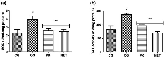 Superoxide dismutase enzyme activity (SOD) (a) and catalase enzyme activity (CAT) (b). Values expressed as means ± SDs. * Indicates a significant difference (p ˂ 0.05) with respect to GC; ** indicates a significant difference (p ˂ 0.05) with respect to OG. CG: control group, OG: obese rats, PK: obese rats that received extract, and MET: obese rats that received metformin.