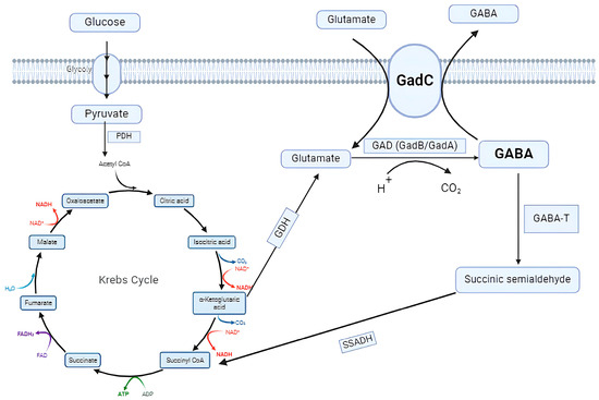 Metabolic pathway GABA production (Adapted from [18,46]). Abbreviations: PDH, pyruvate dehydrogenase; GDH, glutamate dehydrogenase; GAD, glutamate decarboxylase; GABA-T, GABA transaminase; SSADH, succinic semialdehyde dehydrogenase.