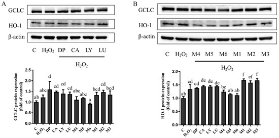 The effects of phytochemical-induced Nrf2 signaling were investigated by the expression of two Nrf2-target downstream proteins, namely, GCLC and HO-1 (Figure 1). The results of the Western blot assay showed that the protein expression of GCLC and HO-1 was slightly enhanced in the individual phytochemical groups. It was observed that the protein expression of GCLC was attenuated in the M4, M5, and M6 groups treated with phytochemical combinations. Among the combinations, the M6 group (DP: LY = 7:3) showed significantly less GCLC protein expression than individual DP and LY (p < 0.05). The protein expression of HO-1 in the M1, M2, and M3 groups increased dramatically, while it decreased markedly in the M4, M5, and M6 groups.