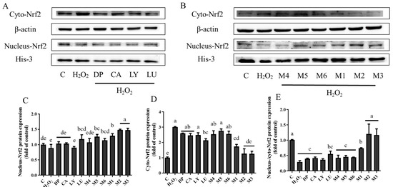 The effects of the pretreatments with individual phytochemicals and combinations of phytochemicals on cyto-Nrf2 and nucleus-Nrf2 protein expression in H9c2 cells. (A) The cells were treated with delphinidin, chlorogenic acid, lycopene, lutein, or (B) their combinations. The protein expression of cyto-Nrf2 (C), nucleus-Nrf2 (D), and their ratios (E) were analyzed by Western blot. β-actin and His-3 were used as the internal control in the cytosolic and nuclear proteins, respectively. DP—delphinidin, CA—chlorogenic acid, LY—lycopene, LU—lutein, M1: CA-LU F3/10, M2: DP-CA F7/10, M3: DP-LY F5/10, M4: LY-LU F5/10, M5: CA-LU F9/10, M6: DP-LY F7/10. Where CA-LU F1/10 refers to the quantity of chlorogenic acid (1/10) to lutein (9/10) in the binary mixtures. Values with different letters (a–e) indicate that the cyto-Nrf2 or/and nucleus-Nrf2 protein expression in each group was significantly different (p < 0.05).