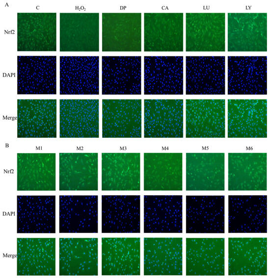 Immunofluorescence staining in H9c2 cells pretreated with individual and phytochemical combinations. (A) The cells were treated with delphinidin, chlorogenic acid, lycopene, lutein, or (B) their combinations. The immunofluorescence assay evidenced that H2O2 promoted the nuclear translocation of nuclear factor erythroid 2-related factor 2 (Nrf2) in H9c2 cells. Nrf2 protein was visualized with Nrf2 antibody and FITC-labeled antibody, and the nuclear morphology was visualized with DAPI dye. DP—delphinidin, CA—chlorogenic acid, LU—lutein, LY—lycopene, M1: CA-LU F3/10, M2: DP-CA F7/10, M3: DP-LY F5/10, M4: LY-LU F5/10, M5: CA-LU F9/10, M6: DP-LY F7/10. Where CA-LU F1/10 refers to the quantity of chlorogenic acid (1/10) to lutein (9/10) in the binary mixtures.