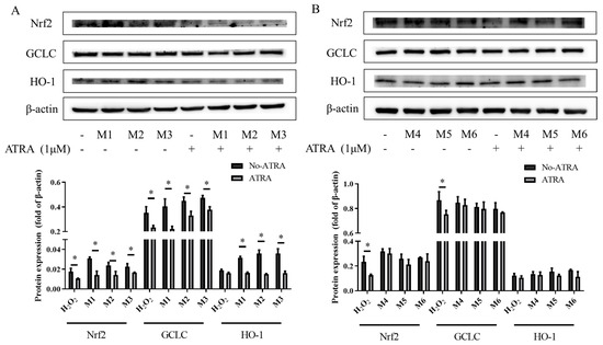 Effects of the pretreatments with all-trans retinoic acid (ATRA) and no ATRA in the M1, M2, M3, M4, M5, and M6 groups on Nrf2, guidance control launch console (GCLC), and Heme oxygenase 1 (HO-1) protein expression in H9c2 cells. (A) Cells treated with phytochemical combinations (M1, M2, and M3). (B) Cells treated with phytochemical combinations (M4, M5, and M6). All-trans retinoic acid (ATRA) was used to inhibit the Nrf2 pathway and observe the expression of Nrf2, HO-1, and GCLC. β-actin was used as the internal control for the Western blot assay. DP—delphinidin, CA—chlorogenic acid, LY—lycopene, LU—lutein, M1: CA-LU F3/10, M2: DP-CA F7/10, M3: DP-LY F5/10, M4: LY-LU F5/10, M5: CA-LU F9/10, M6: DP-LY F7/10. Where CA-LU F1/10 refers to the quantity of chlorogenic acid (1/10) to lutein (9/10) in the binary mixtures. * p < 0.05 indicated that the protein expression of the ATRA group was significantly different compared with the no-ATRA group.