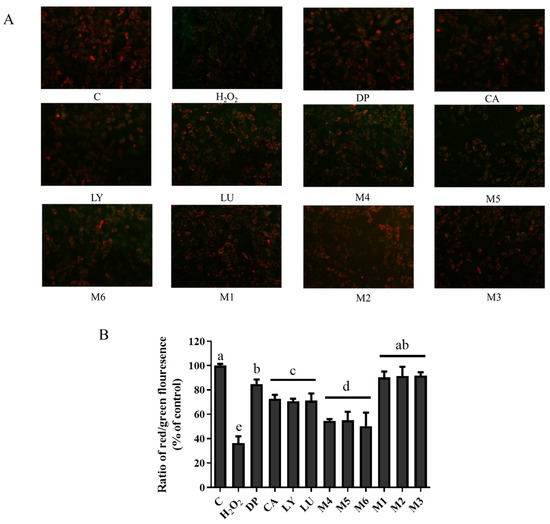 Effects of phytochemicals and their combinations on H2O2-induced dissipation of mitochondrial membrane potential (ΔΨm). (A) Morphology of H9c2 cells with or without pretreatment with phytochemicals. (B) The fluorescence intensity red-to-green ratio indicated a change in ΔΨm. JC-1 dye was added to determine the dissipation of ΔΨm. JC-1 identifies mitochondria exhibiting low membrane potentials by the emission of green fluorescence but also at high membrane potentials emitting a bright red-orange fluorescence. DP—delphinidin, CA—chlorogenic acid, LY—lycopene, LU—lutein, M1: CA-LU F3/10, M2: DP-CA F7/10, M3: DP-LY F5/10, M4: LY-LU F5/10, M5: CA-LU F9/10, M6: DP-LY F7/10. Where CA-LU F1/10 refers to the quantity of chlorogenic acid (1/10) to lutein (9/10) in the binary mixtures. Values with different letters (a–e) indicate that the membrane potentials of each group are significantly different (p < 0.05).