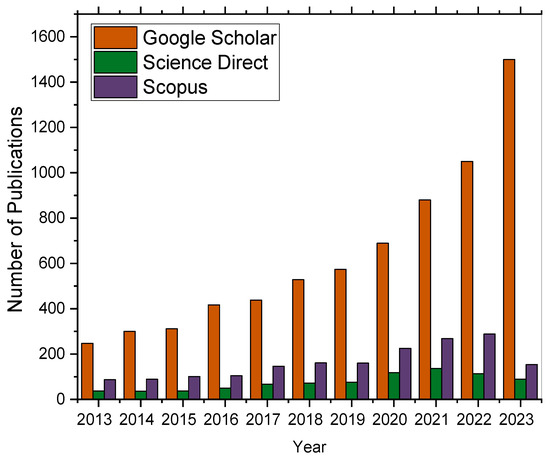 Number of publications in three scientific databases (Google Scholar, Scopus, and Science Direct) issued from 2013 to March 2023 related to keyword searches for “boron-doped diamond electrode, polymer, and phenol detection”.